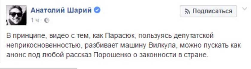 "В принципе, видео с тем, как Парасюк, пользуясь депутатской неприкосновенностью, разбивает машину Вилкула, можно пускать как анонс под любой рассказ Порошенко о законности в стране", - пишет на своей странице в соцсети Facebook блогер Анатолий Шарий.