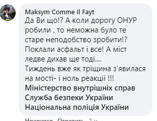В комментариях у автора фотографий отметили губернатора Львовской области Максима Козицкого и аккаунт областного "Укравтодора". И сегодня чиновники подтвердили, что знали о проблеме до падения моста.