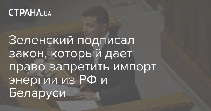 Президент Украины Владимир Зеленский подписал закон № 1396-ІХ "О внесении изменений в некоторые законодательные акты Украины относительно сертификации оператора системы передачи", который предполагает синхронизацию энергосистемы Украины с энергосистемой Европы. Закон подразумевает запрет на импорт электроэнергии из России и Беларуси.