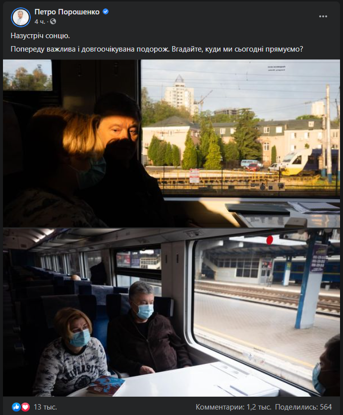 Ранее Петр Порошенко написал о поездке на своей странице в Facebook. Он отметил, что едет "навстречу солнцу" (т.е. на восток, - Ред.), предложив угадать точку назначения маршрута. Отметим, что под предлогом этой поездки экс-президент не пришел на допрос в СБУ.