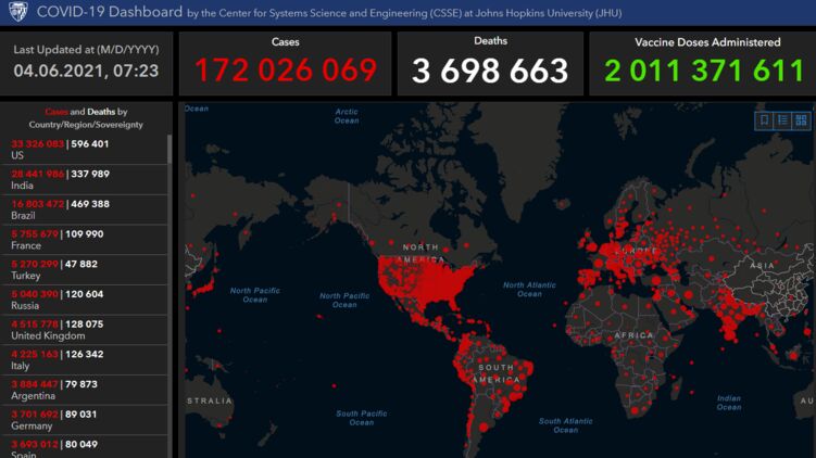 По состоянию на утро 4 июня, число зараженных в мире перевалило за 172 миллиона, фото: arcgis.com
