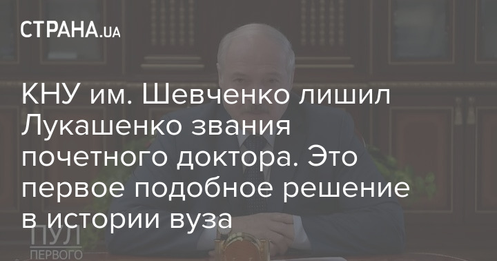 Президента Беларуси Александра Лукашенко лишили звания почетного доктора Киевского национального университета имени Шевченко, которое он получил в период президентства Виктора Ющенко. Ученый совет столичного вуза принял за это решение путем тайного голосования. Об этом сообщает ВВС News Украина со ссылкой на источник, близкий к руководству КНУ им. Шевченко.