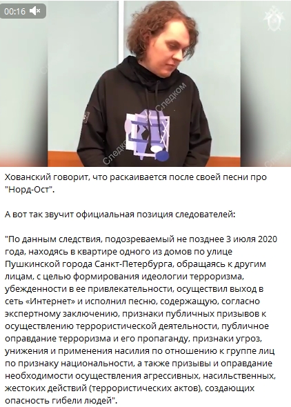 Причиной возбуждения дела против Хованского стал ролик с песней про мюзикл "Норд-Ост". В композиции он упоминал теракт, который произошел 23 октября 2002 года в театральном центре на Дубровке. Видео было опубликовано около года назад на официальном YouTube-канале.