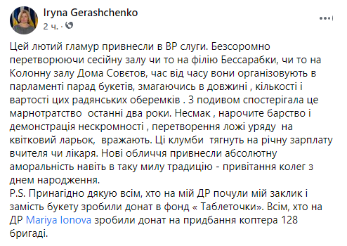 "Этот яростный гламур привнесли в ВР слуги. Беззастенчиво превращая сессионный зал то ли в филиал Бессарабки, то ли в Колонный зал Дома Советов, время от времени они организуют в парламенте парад букетов, соревнуясь в длине, количестве и стоимости этих советских охапок", - написала она в Facebook.