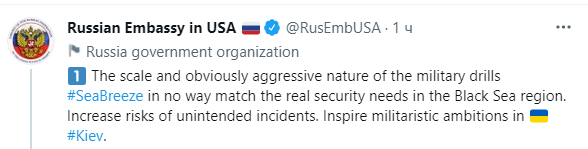 Дипломаты указали, что масштаб и "явно агрессивный характер" маневров Sea Breeze повышает риски непреднамеренных инцидентов в Черном море и никоим образом не соответствуют реальным потребностям региональной безопасности. К тому же, добавили в дипмиссии, учения "поощряют милитаристские амбиции Киева".