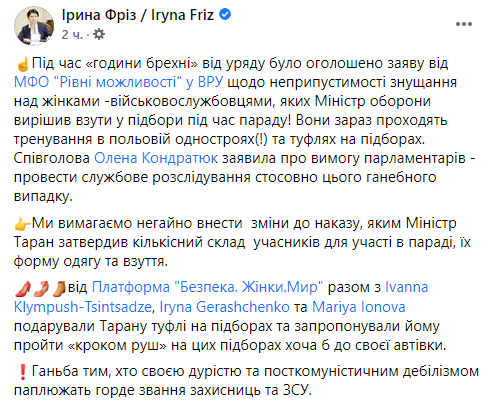 "Существует приказ, в котором указаны образцы военной формы для женщин, там предусмотрены каблуки летом и зимой. Но это не вопрос парада и плаца, где мужчины пойдут в берцах! Это не равенство! Это унижение!" - пишет Геращенко.
