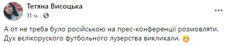 "А вот не надо было на русском на пресс-конференции разговаривать. Дух великорусского футбольного лузерства вызвали", - то ли в шутку, то ли всерьез написала журналистка Татьяна Высоцкая.