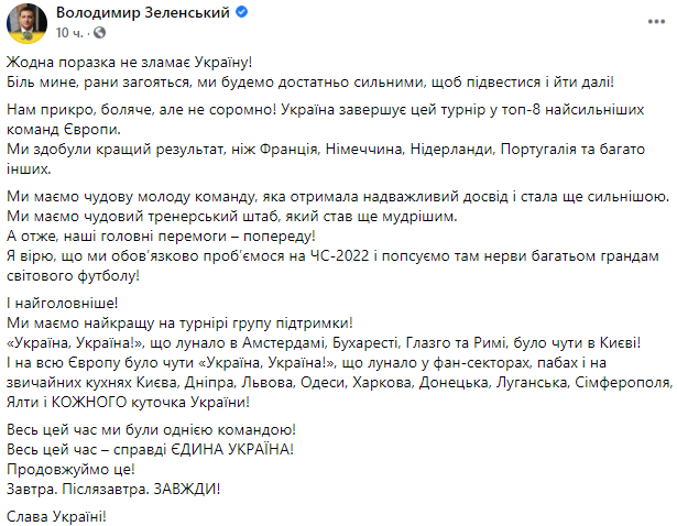 Президент написал, что "поражение не сломает Украину", и заявил, что ему "больно, но не стыдно". А также перевел разговор на то, что Украина стала снова единой, когда болела за сборную.