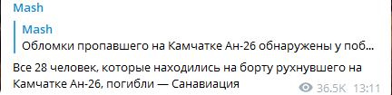 Как сообщает Telegram-канал Mash со ссылкой на информацию Санавиации РФ, все 28 человек, которые были на борту, погибли.