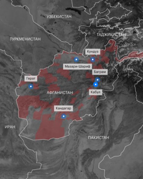 Территория, которую взяли под контроль талибы, обозначена красным. Источник РБК