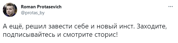 "А ещё, решил завести себе и новый инст. Заходите, подписывайтесь и смотрите сторис", - заявил Роман Протасевич в соцсети.
