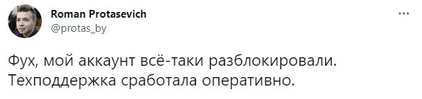 Находящийся под домашним арестом белорусский оппозиционер Роман Протасевич, чей Twitter-аккаунт заблокировали сегодня утром, сообщил о его разблокировке.