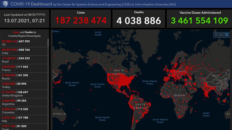 По данным на 13 июля, число зараженных на Земле перевалило за 187 миллионов, фото: arcgis.com