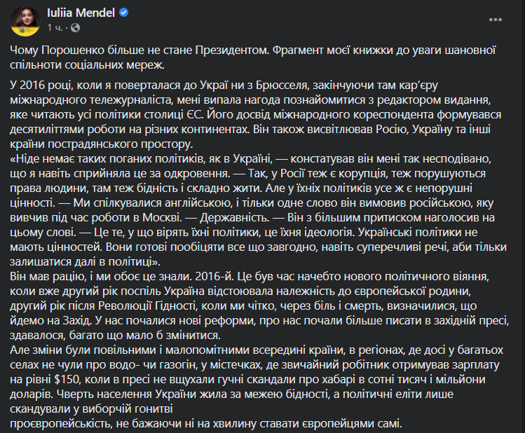 "Петр Порошенко пытался искусственно насадить консервативные идеалы начала ХХ века, которые потеряли свою актуальность и для многих уже не казались привлекательными. Он потратил уйму усилий на построение формулы идентичности со слишком хрупкими компонентами: армией, на которой наживалось его окружения, языке, которым не общались в его семье, вере, которую он отождествлял с автокефалии Украинской Церкви и которую превратил в попсовый электоральный тур с Томосом", - пишет Мендель.