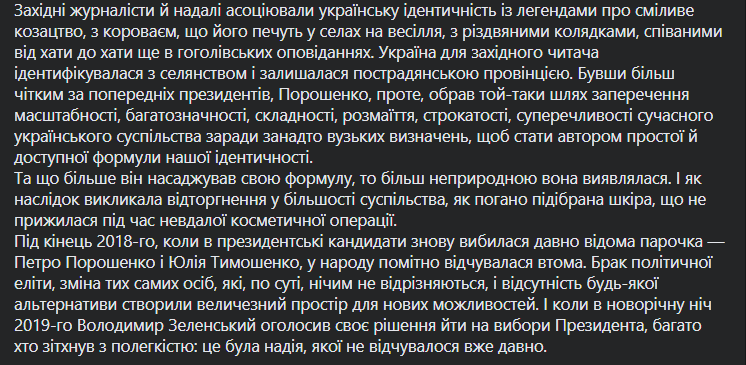 "Украина для западного читателя идентифицировалась с крестьянством и оставалась постсоветской провинцией. Будучи более четким предыдущих президентов, Порошенко, однако, выбрал тот же путь отрицания масштабности, многозначности, сложности, разнообразия, пестроты, противоречивости современного украинского общества ради слишком узких определений, чтобы стать автором простой и доступной формулы нашей идентичности", - рассуждает бывшая пресс-секретарь президента.