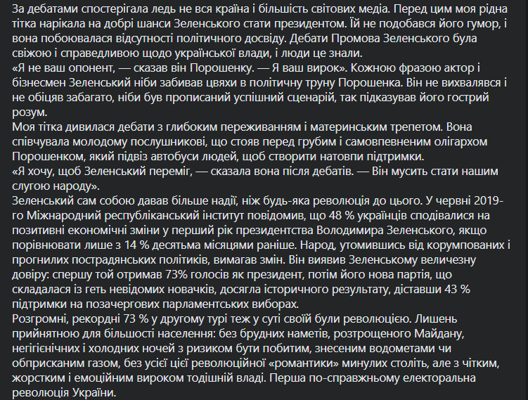 "К концу 2018-го, когда в президентские кандидаты снова выбилась давно известна парочка - Петр Порошенко и Юлия Тимошенко, у народа заметно ощущалась усталость. Недостаток политической элиты, изменение тех же лиц, которые, по сути, ничем не отличаются, и отсутствие какой-либо альтернативы создали огромное пространство для новых возможностей. И когда в новогоднюю ночь 2019-го Владимир Зеленский объявил свое решение идти на выборы Президента, многие вздохнули с облегчением: это была надежда, которой не ощущалось уже давно", - вспоминает она.