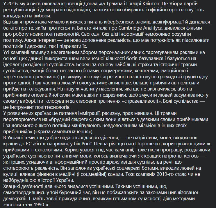 "В Украине темы, которые хорошо предоставляются для разделения, - это патриотизм, язык, вхождение страны в ЕС или направление в сторону России. Разумеется, господин Порошенко пользовался этими же приемами и технологиями. Пользовался и во время кампании, и уже после проигрыша, разделяя украинское общество вопросами языка, кого определяя как лучших патриотов, кого-то - как худших, вбрасывая в информационное пространство дразнящие для общества вещи, искажают реальность. Он заполонил украинские соцсети ботами, выводил людей на улицы, вливал деньги в медийные (и соцмедийные) каналы. Поэтому кампания 2019-го стала едва ли не самой грязной в истории Украины", - рассуждает она.