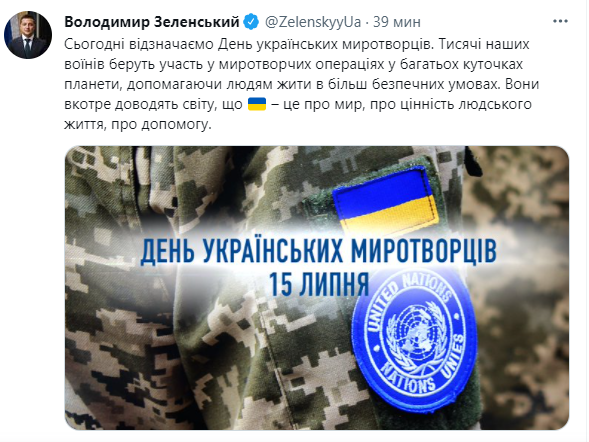 "Сегодня отмечаем День украинских миротворцев. Тысячи наших воинов участвуют в миротворческих операциях во многих уголках планеты, помогая людям жить в более безопасных условиях. Они в очередной раз доказывают миру, что Украина - это о мире, о ценности человеческой жизни, о помощи", - написал президент.