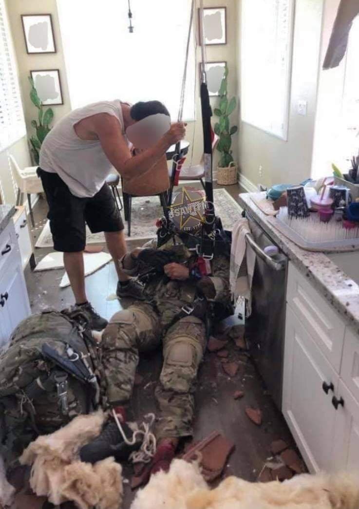Вечером 6 июля в небе над калифорнийским городом Атаскадеро заметили несколько парашютистов, один из которых потерял управление и крутился в воздухе. В результате десантник рухнул на жилой дом, пробил крышу и выжил.