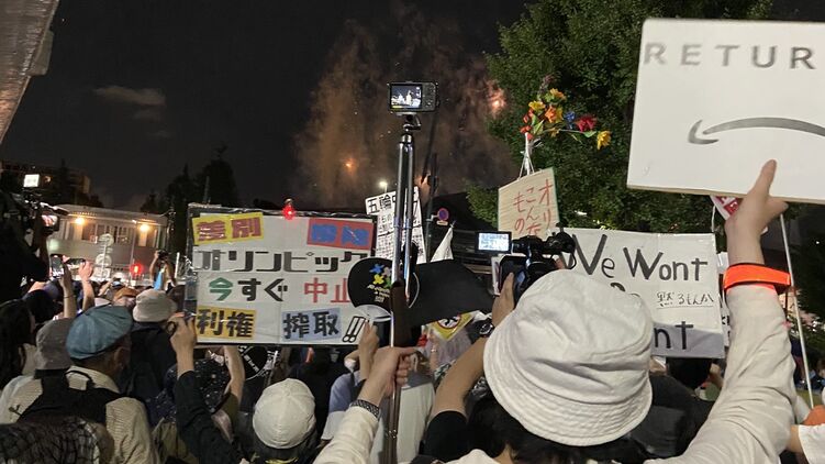 HAPPENING NOW - Large anti Olympics protest going on in Tokyo, Japan during opening ceremony.pic.twitter.com/TGcjbf7TAj