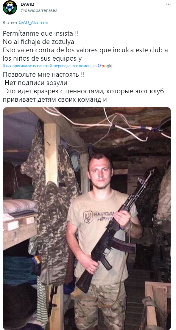 Фанаты пишут о том, что соглашение с Зозулей идет вразрез с ценностями, которые этот клуб прививает молодым футболистам. И опубликовали фото с футболистом, который держит автомат Калашникова в землянке ВСУ.