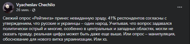 "Учитывая, что вопрос задавался политически острый и многие, особенно в центральных и западных областях, могли не сказать правду, реальная цифра может быть даже еще выше. Или опрос – манипуляция, обоснование для нового витка украинизации", - комментирует результаты опроса журналист Вячеслав Чечило