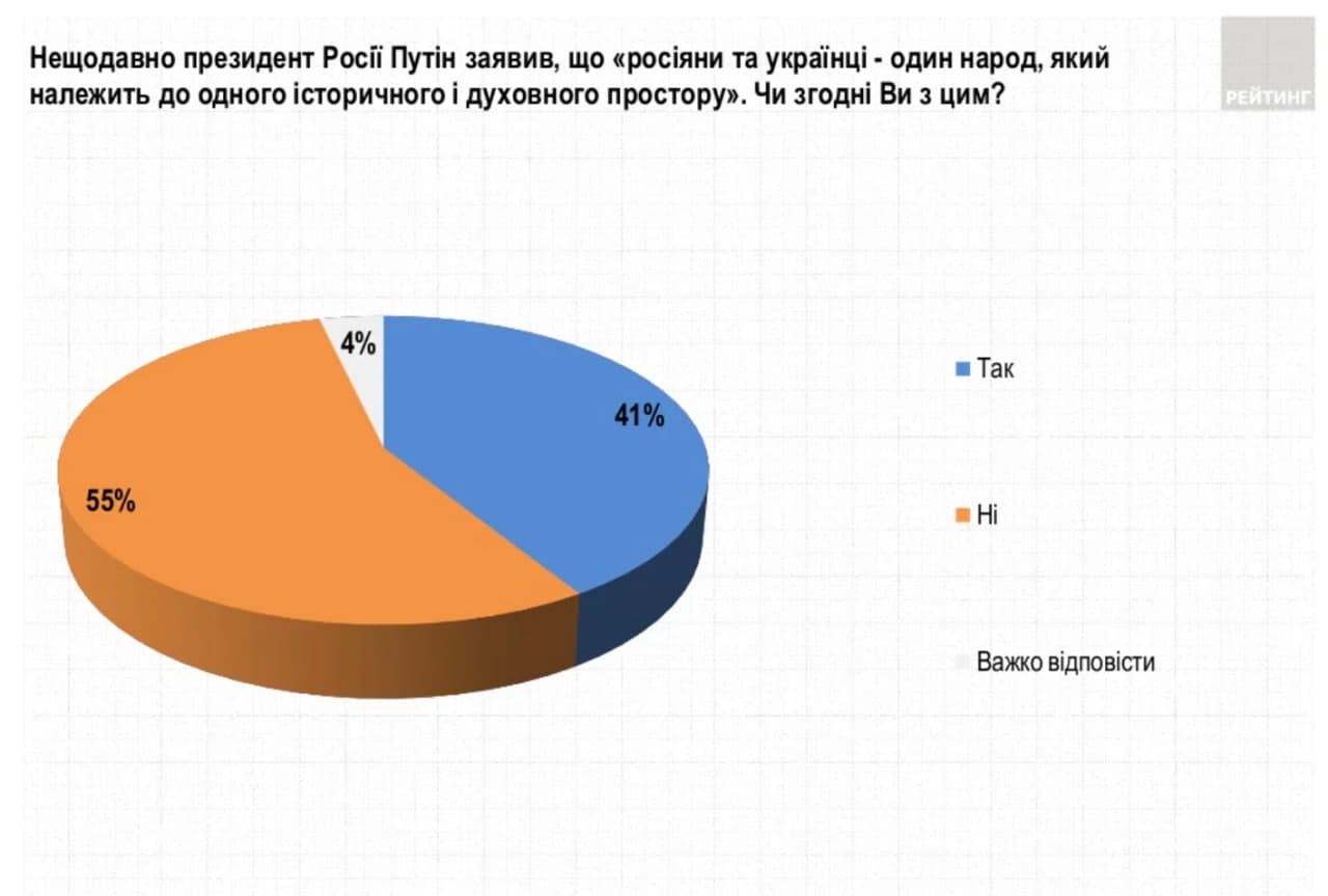 41% украинцев согласны с недавним заявлением президента России Владимира Путина, что "русские и украинцы - один народ, который относится к одному историческому и духовному пространству". При этом 55% процентов не согласны с подобным тезисом.