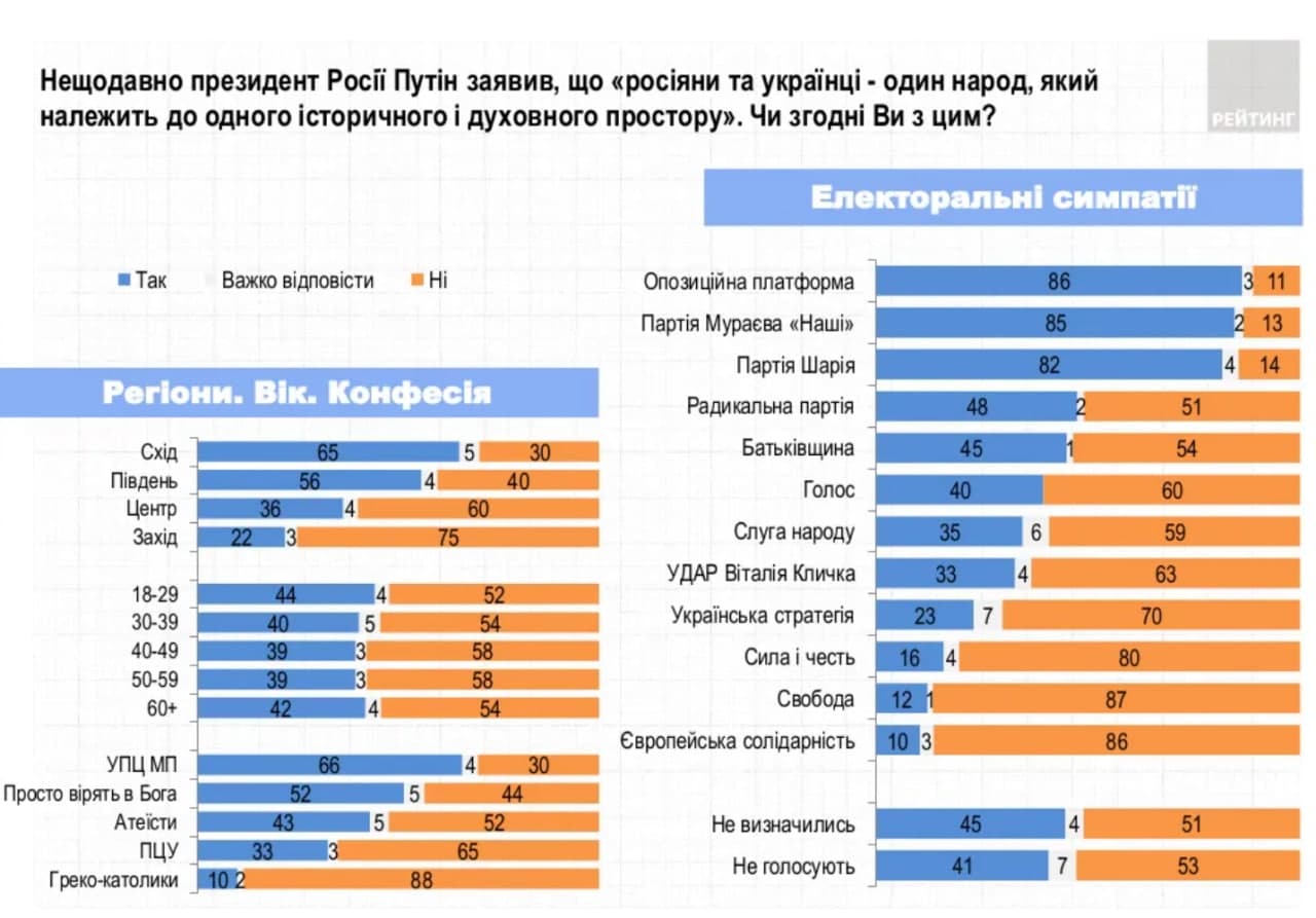 Результаты опроса отличаются в зависимости от географии и политических предпочтений. Так, с тезисом о едином народе согласны на востоке и юге страны. Там согласились с этим 65% и 56% соответственно.