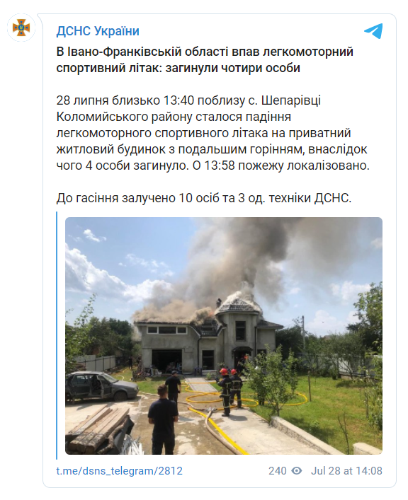 "28 июля около 13:40 неподалеку от с. Шепаровцы Коломыйского района произошло падение легкомоторного спортивного самолета на частный жилой дом с последующим горением, в результате этого 4 человека погибли", - говорится в сообщении.