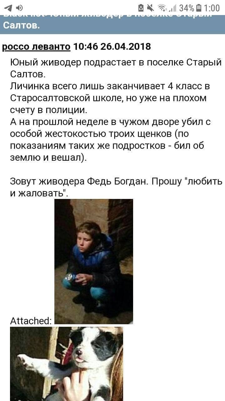По данным местного паблика "Харьков сейчас", убийцу зовут Богдан Федь. Он закончил четвертый класс. Также в паблике разметили его фото и сообщили, что на прошлой неделе мальчик забил до смерти троих щенков.