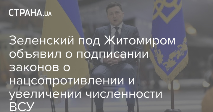 Президент Украины Владимир Зеленский в четверг, 29 июля, во время визита Житомирскую область подписал законы об основах национального сопротивления (№5557) и об увеличении численности Вооружённых сил Украины на 11 тысяч военнослужащих (№5558).