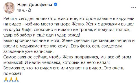 В ночь на субботу в центре Киева избили танцора из балета певицы Нади Дорофеевой.