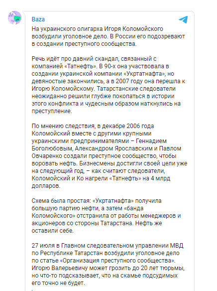 Согласно описанной схеме, Укртатнафта получила нефть в больших объемах, "а затем "банда Коломойского" отстранила от работы менеджеров и акционеров со стороны Татарстана. Нефть же оставили себе", - описывает произошедшее Baza