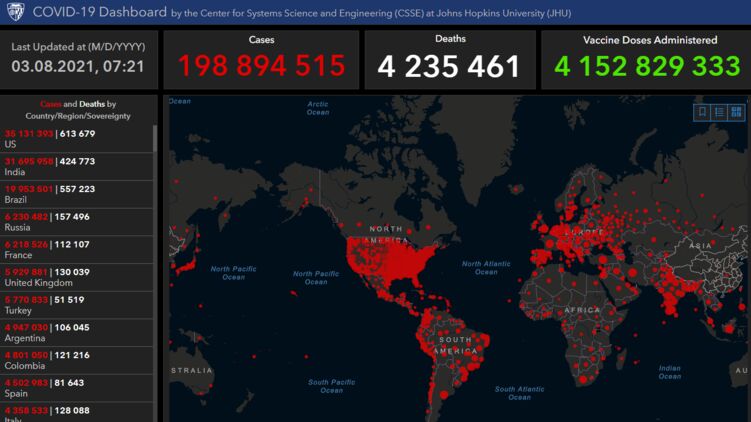 Данные на 3 августа. До печальной отметки в 200 миллионов зараженных уже немного, фото: arcgis.com