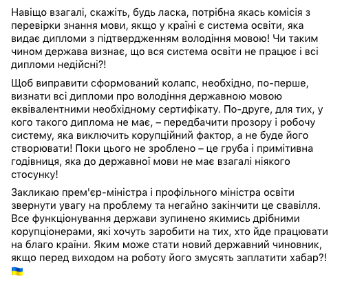 Во-вторых, для тех, у кого такого диплома нет, – предусмотреть прозрачную и рабочую систему, которая исключит коррупционный фактор, а не будет его создавать! Пока этого не сделано – это грубая и примитивная кормушка, которая к государственному языку не имеет вообще никакого отношения!