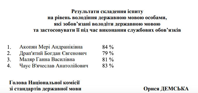 Также прямо накануне назначения сертификаты о знании украинского языка были выданы двум заместителям министра инфраструктуры Мустафе Найему (сдал экзамен на 89%) и Василию Шкуракову (85%). Правда в этом случае их имена оказались среди нескольких десятков других чиновников, прошедших экзаменацию.