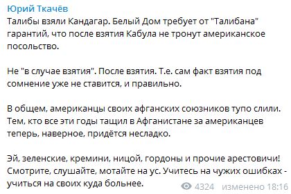 В общем, американцы своих афганских союзников тупо слили. Тем, кто все эти годы тащил в Афганистане за американцев теперь, наверное, придётся несладко.