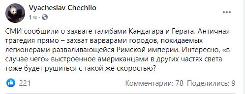 "СМИ сообщили о захвате талибами Кандагара и Герата. Античная трагедия прямо – захват варварами городов, покидаемых легионерами разваливающейся Римской империи. Интересно, "в случае чего" выстроенное американцами в других частях света тоже будет рушиться с такой же скоростью?" - написал журналист Вячеслав Чечило.