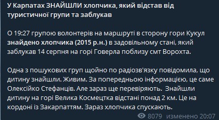 Там рассказали, что ребенок, который потерялся в субботу на Говерле был найден сегодня в 19:27. Его нашли волонтеры на маршруте в сторону горы Кукул.