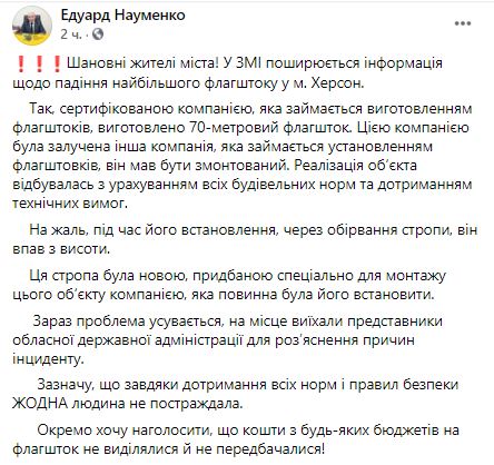По словам заместителя Херсонской ОГА Эдуарда Науменко, 70-метровый флагшток был изготовлен сертифицированной компанией. Она привлекла еще одну компанию для установления конструкции.