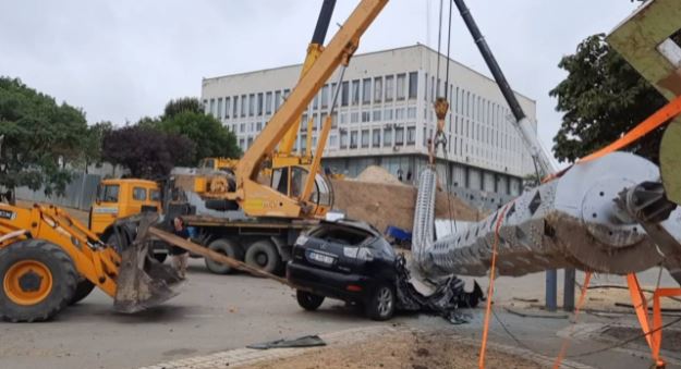 Причем рухнул не просто, а раздавил припаркованный под ним "Лексус", который по иронии судьбы принадлежал чиновнику, ответственному за установку флагштока.