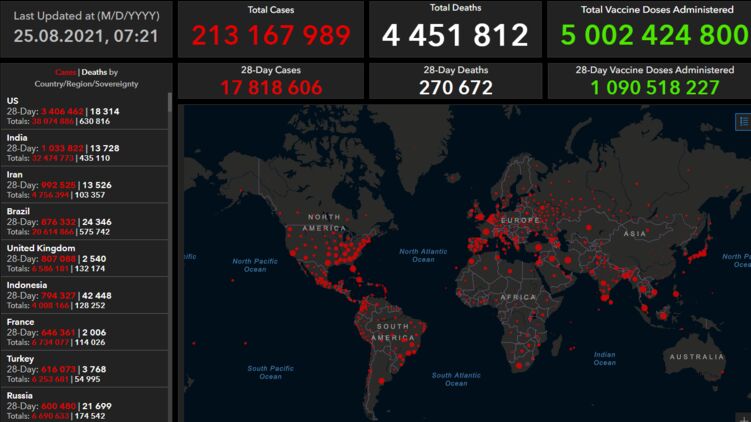 А на планете отмечено (25 августа, 08.15 по Киеву - Ред.) по последним данным университета Дж. Хопкинса уже 213 167 989 зараженных. Умерло от коронавируса - 4 451 812 человек. В тройке лидеров три страны - США, Индия и Бразилия.