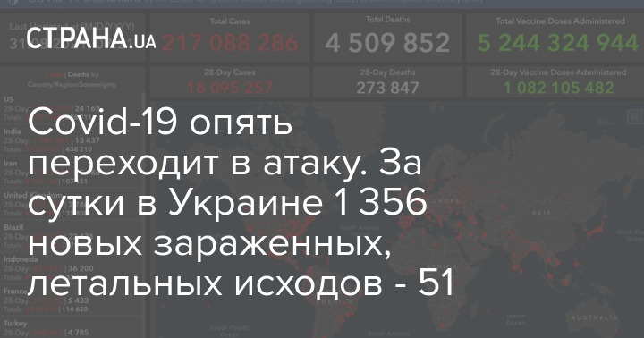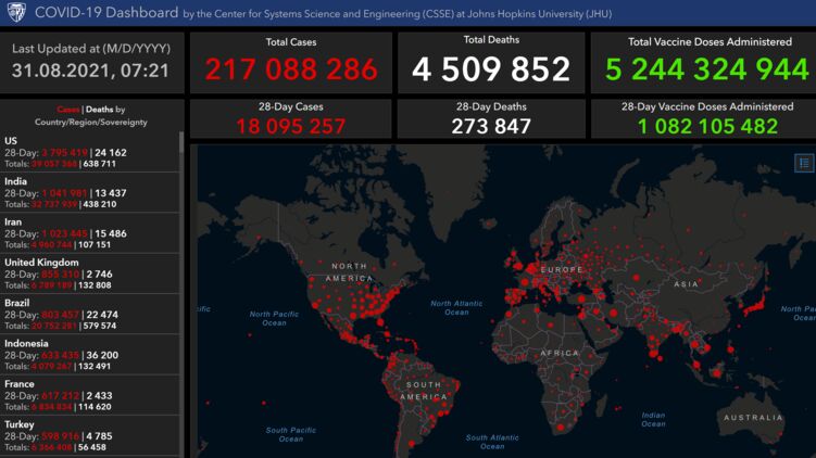 По данным университета Джона Хопкинса на 08:00 утра 31 августа в мире коронавирус выявили у 217 088 286 человек. Умерло с начала пандемии 4 509 852 заболевших.