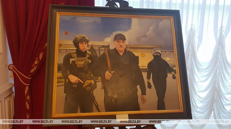 "Вы фактически первые, кто видит этот экспонат. Картину нарисовала без какого-либо заказа по собственному велению души дочка одного из сотрудников Службы безопасности президента", - заявила секретарь президента Наталья Эйсмонт.