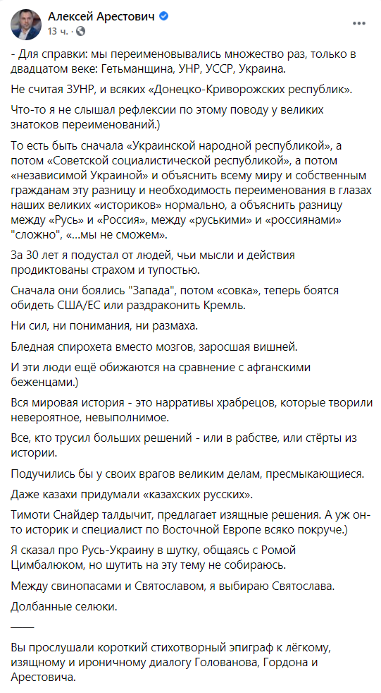 "Мы переименовывались множество раз, только в двадцатом веке: Гетьманщина, УНР, УССР, Украина. Не считая ЗУНР, и всяких «Донецко-Криворожских республик». Что-то я не слышал рефлексии по этому поводу у великих знатоков переименований", пишет Арестович.