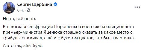 "Не то, всё не то. Вот когда член фракции Порошенко своего же коалиционного премьер-министра Яценюка страшно сказать за какое место с трибуны стаскивал, ещё и с букетом цветов, это была картинка. А это так, абы було", - прокомментировал журналист Сергей Щербина.