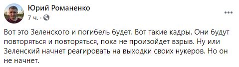 "Вот это Зеленского и погибель будет. Вот такие кадры. Они будут повторяться и повторяться, пока не произойдет взрыв. Ну или Зеленский начнет реагировать на выходки своих нукеров. Но он не начнет", - написал политолог Юрий Романенко.