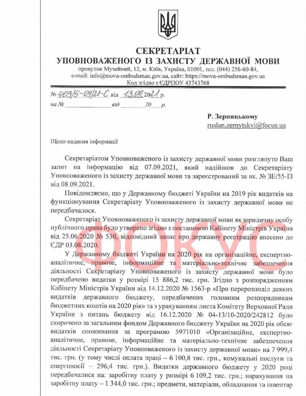 В течение 2020 года со дня создания ведомства 3 августа на секретариат мовного омбудсмена потратили более 6,84 миллионов гривен. Из этой суммы 5,44 миллионов составили зарплаты сотрудников ведомства. А 1,07 миллиона гривен - "начисления на заработную плату".