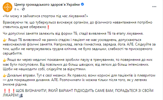Медики разъяснили украинцам, может ли заниматься спортом человек, страдающий туберкулезом. Учитывая, что туберкулез истощает организм, к физической нагрузке нужно относиться очень осторожно, сообщают в Центре общественного здоровья при Минздраве.