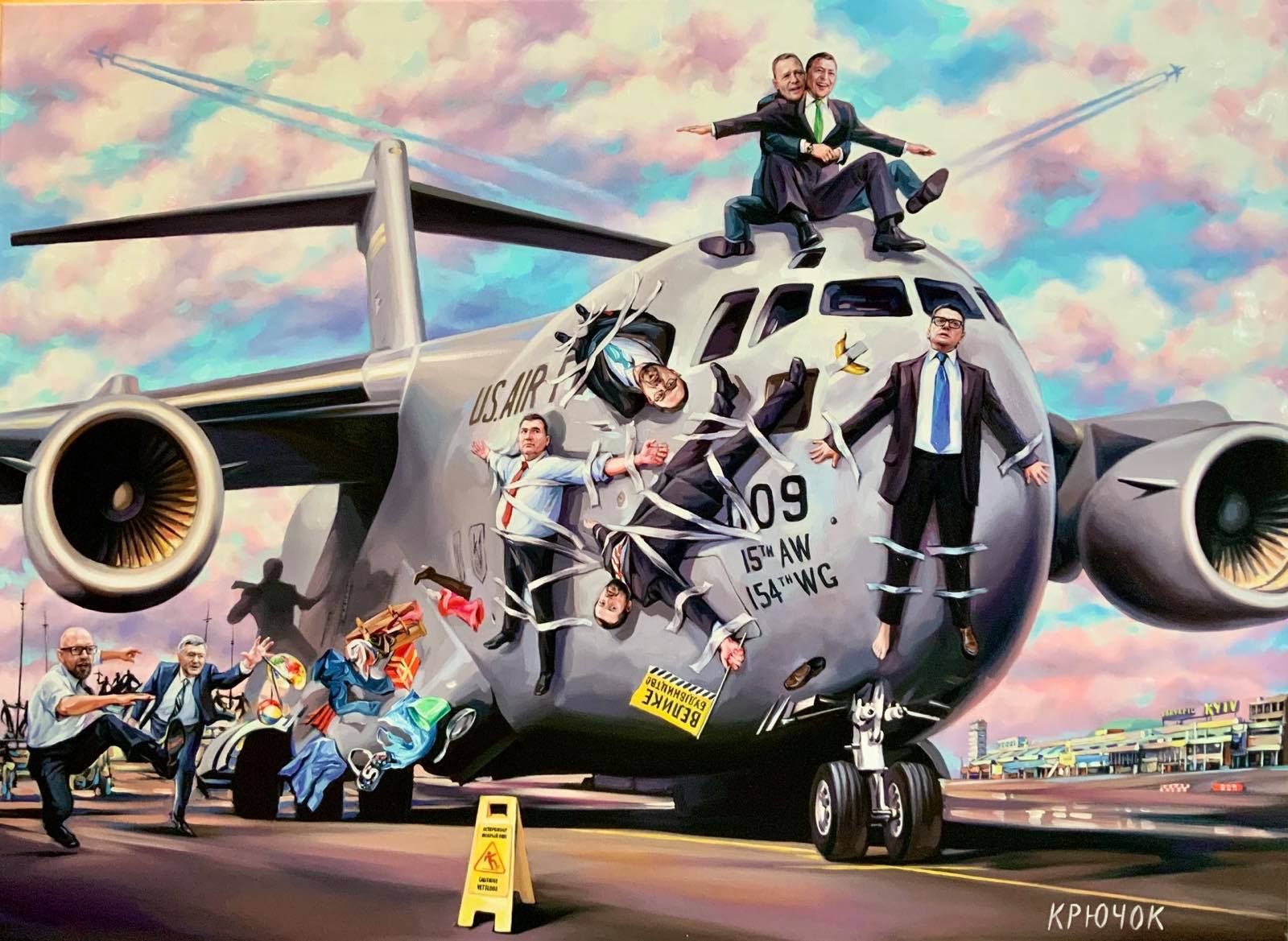 Заместитель главного редактора "Страны" Светлана Крюкова выставила на аукцион очередную картину, на которой вполне узнаваемые украинские политики бегут из страны, "оседлав" всеми возможными способами американский военный самолет. Таким образом автор проводит аналогию с недавними событиями в оставленном американцами Афганистане, когда многие пытались сбежать из страны, ухватившись за военно-транспортный самолет США.